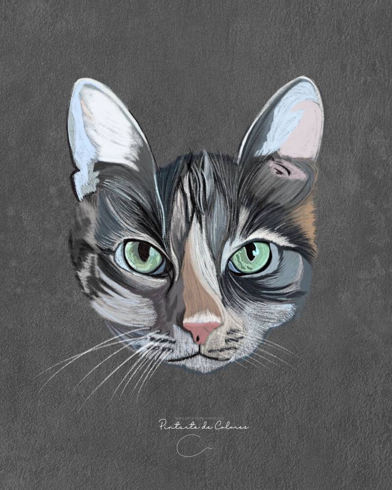 Esta gatita tiene colores blanco, gris de claro a obscuro y un poco de cafe, con unos ojos encantadores que en su fusión hicieron en sí una ilustración personalizada de mis favoritas en mi portafolio.