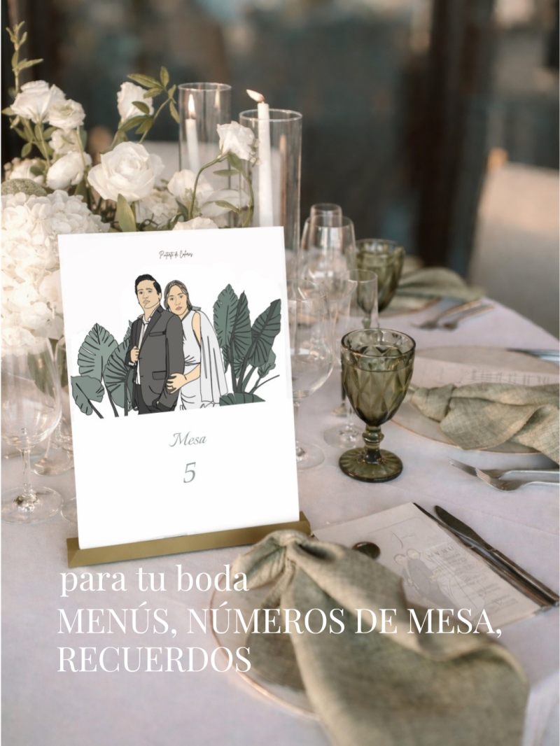 ILUSTRACIÓN PERSONALIZADA IMPRESA EN MEDIA TARJETA SOBRE PAPEL OPALINA DE 150 G., INCLUYE BASE METALICA PARA CADA NÚMERO DE MESA.